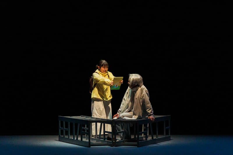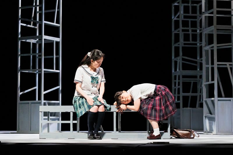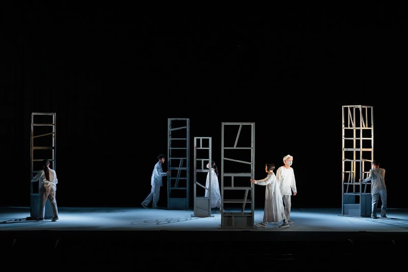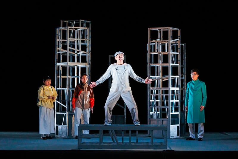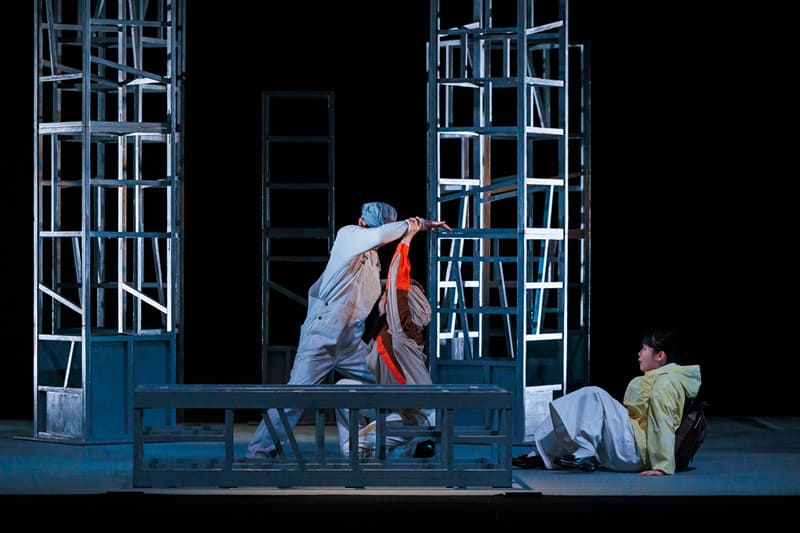 舞台セットの5本の柱をダイナミックに展開し表現される旅の景色は、観る人をロードムービーの世界にいざないます。